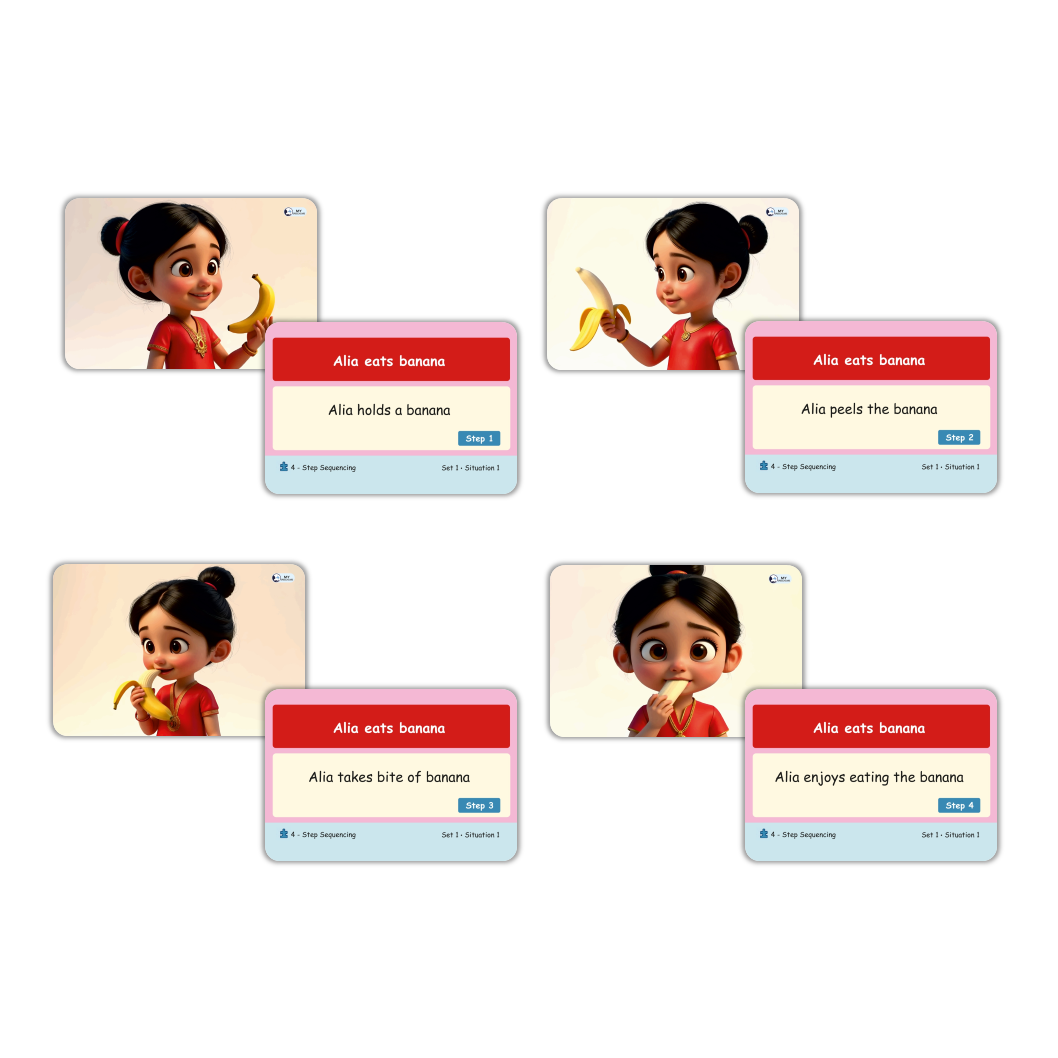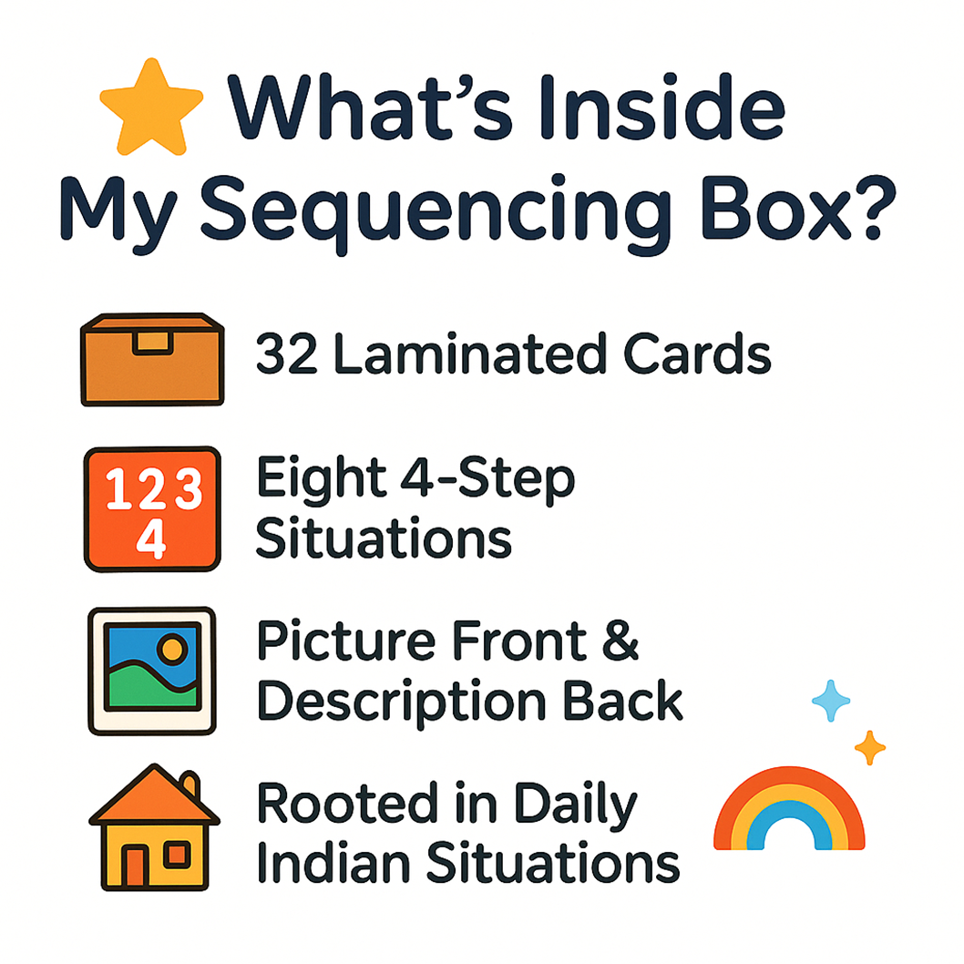 Unlock the power of language and logical thinking with the My Sequencing Box (Set-I) by My SpeechCare! Designed for children and educators, this unique learning tool features 8 engaging story sets with a total of 32 durable cards. Each set guides kids through simple 4-step sequences of everyday activities, making it easy and fun to develop comprehension, storytelling, and sequencing skills.
